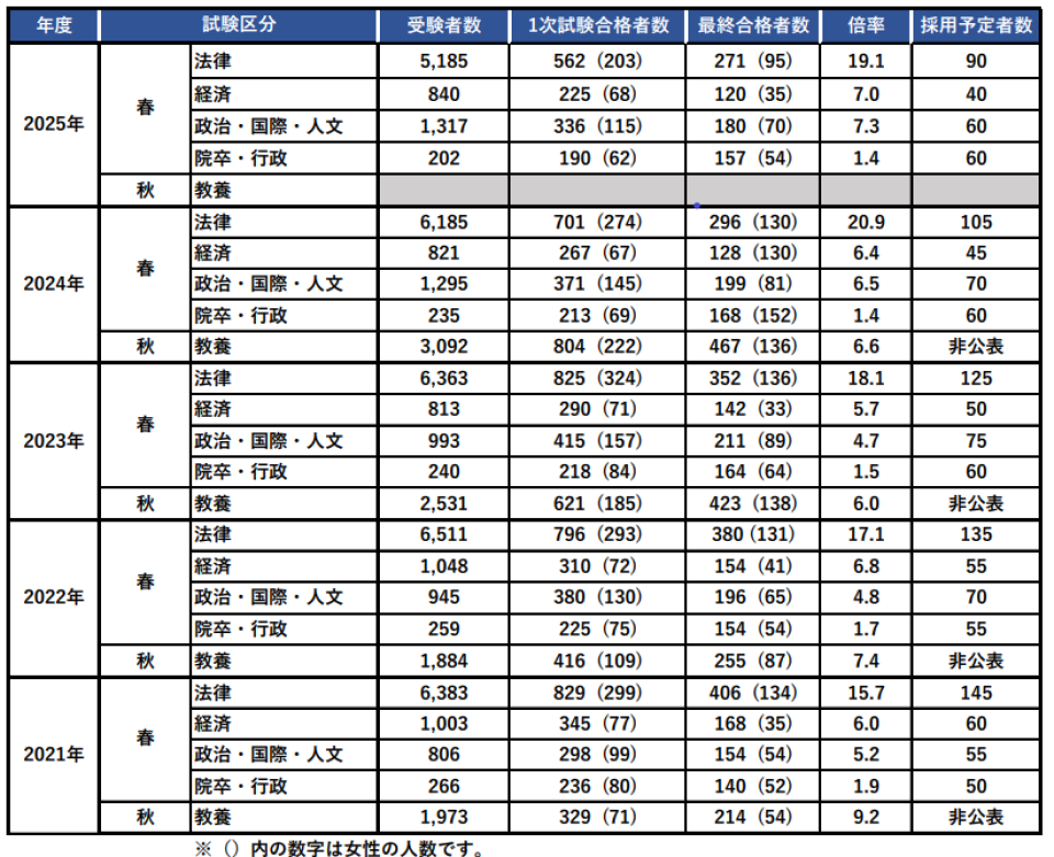 院卒者試験・行政区分を含む各区分の試験実施状況です。倍率だけを見ると大卒の法律区分が高くなっていますが、最初に受験する国家総合職試験が教養区分であること、教養区分で不合格になった受験生が春試験専願の受験生とともに春試験を受験することから難易度が一番高いのは教養区分と言われています。