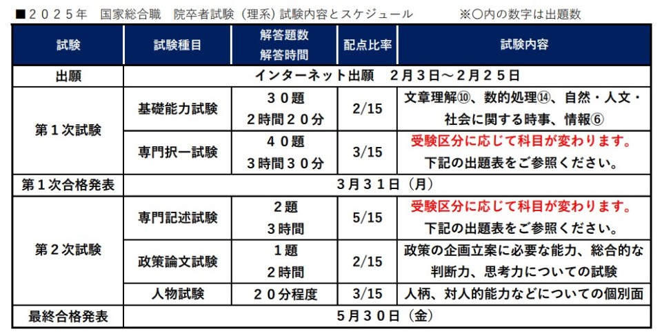 理系の方がこの国家総合職、キャリア官僚になるための試験はどのような仕組みになっているでしょうか。ここでは春に行われる理系(技術系)区分の国家総合職試験(院卒者試験)について詳しく解説していきます。