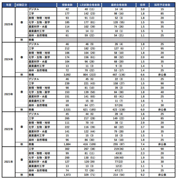 春に行われる試験については大卒向け、院卒向けの試験ともに専門科目(大学以降専門的に学ぶ科目)が出題され、この専門科目についてどの分野のものを選ぶかによってデジタル区分、工学区分、化学・生物・薬学区分、農業科学・水産区分などといった区分が設定されており、大学での専攻に応じた区分で受験することができます。