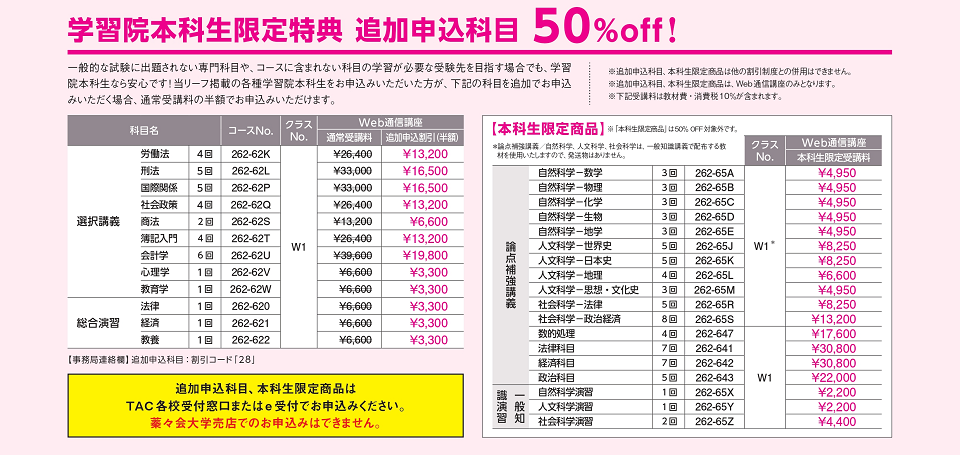| コース名 | メディア | コースNo. | 学習院生 限定受講料(税込) |