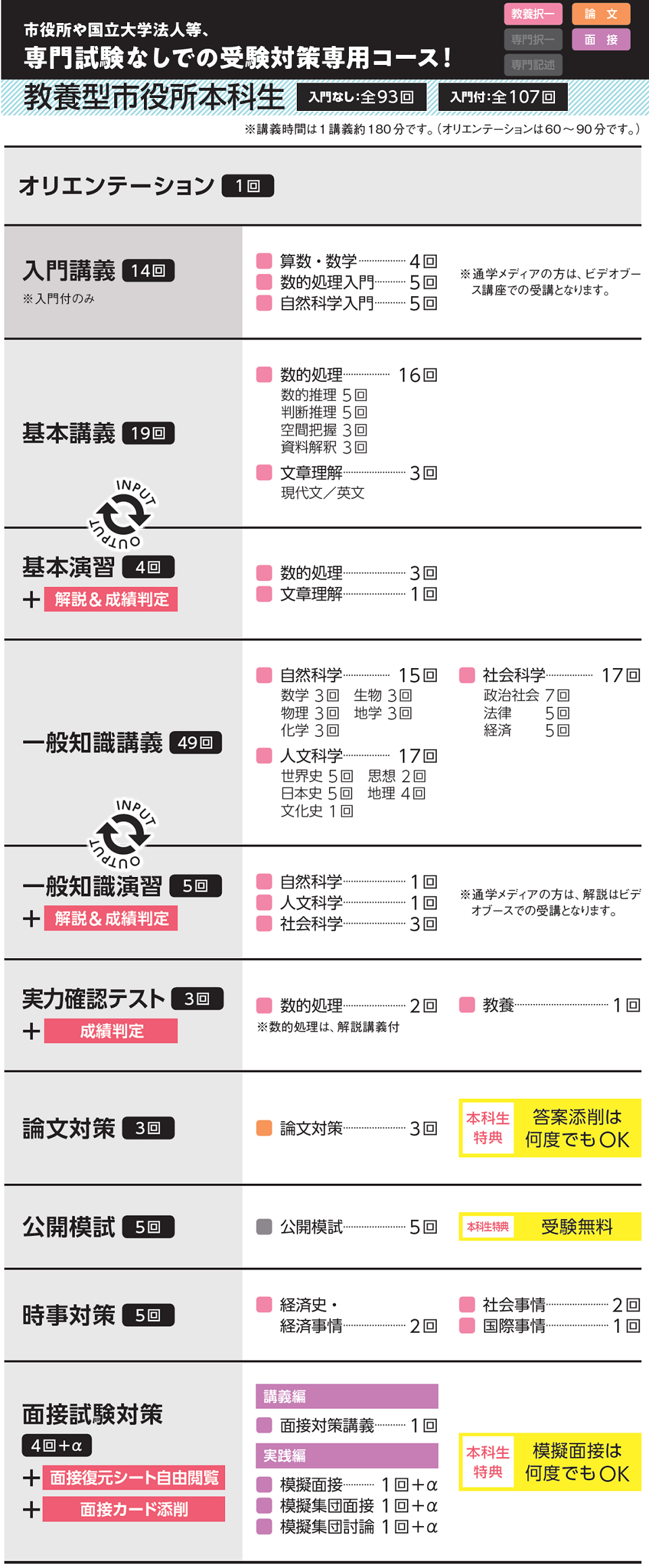 専門科目が出題されない教養型の試験(市役所・国立大学法人等)に特化したカリキュラム。