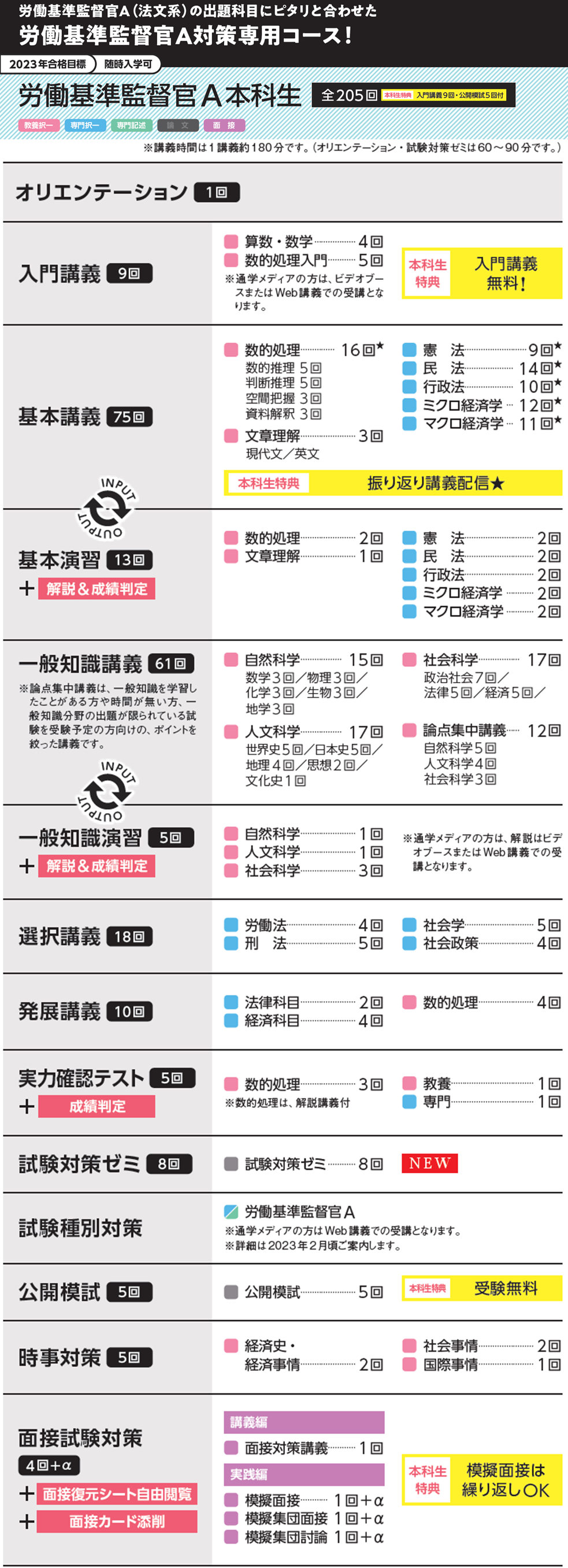 カリキュラムを労働基準監督官A(法文系)の出題科目にピタリと合わせた専用コースです。基礎能力試験、専門試験(択一・記述)、人物試験対策はもちろん、主に労働法・労働事情対策を行う労働基準監督官A対策セミナーもカリキュラムに含まれていますので、総合的な受験対策ができます。