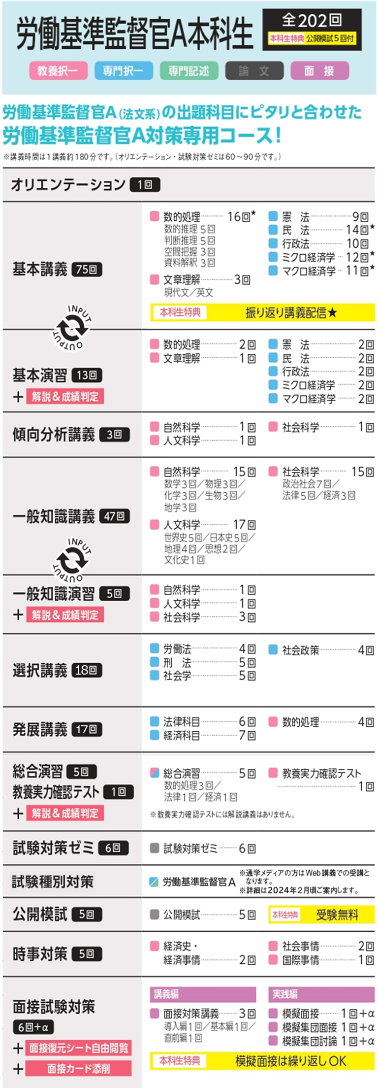 カリキュラムを労働基準監督官A(法文系)の出題科目にピタリと合わせた専用コースです。基礎能力試験、専門試験(択一・記述)、人物試験対策はもちろん、主に労働法・労働事情対策を行う労働基準監督官A対策セミナーもカリキュラムに含まれていますので、総合的な受験対策ができます。