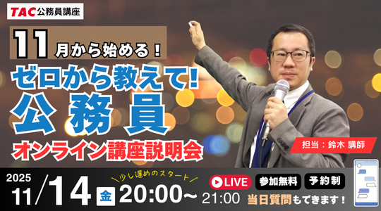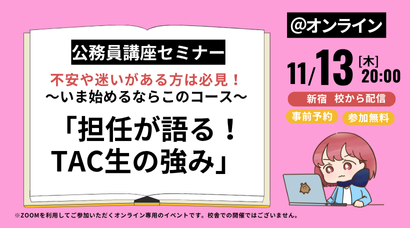 公務員試験対策の“始め方”に不安や迷いがある方は必見!行政事務職志望ならば忙しい方でも大丈夫!「TAC生の強みとは?」「どのコースで始めれば間違いないの?」長年に渡り多くの受験生を見てきた担任講師目線でズバッとお伝えします!ウェビナー終了後、個別相談もできます◎