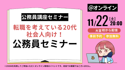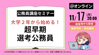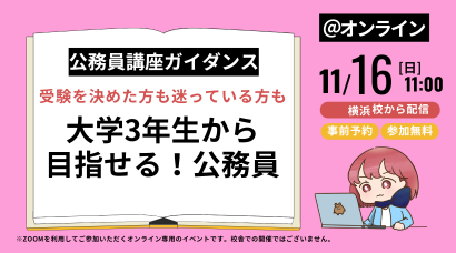「公務員受験は大学4年のタイミング」という常識が2025年から崩れているのをご存知ですか?大学3年で最終合格できて、しかも学習負担が軽い国家・地方公務員試験について紹介する無料ショートウェビナーです。職種の魅力や忙しい方向けの対策講座なども簡単に紹介する予定です。