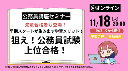公務員を目指す方へ向けたオンラインガイダンスを開催します。今回は担任講師が登壇し、公務員試験に関する情報、これから学習を始める方へのヒントをお届け予定。講座選びに迷っている方や、学習の不安がある方もぜひご参加ください。