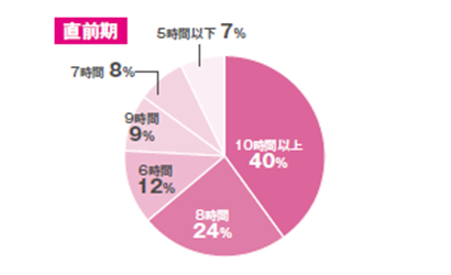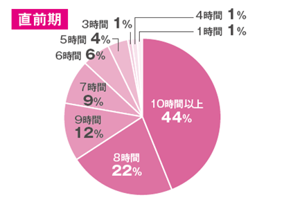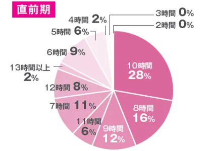 直前期になると、平均学習時間は大幅に伸び、8時間と答えた方が25%でした。また、全回答者の平均は8.5時間で、通常期の2倍以上となりました。