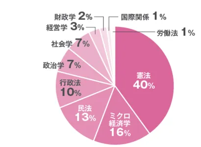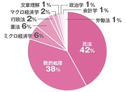 力を入れた科目では、数的処理・民法の2科目で約80%を占めています。これらの科目はいずれも、暗記よりも理解が重要で、予備校生と独学生とでは最も差のつく科目です。