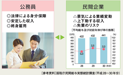 重責を担う公務員は、国家公務員法や地方公務員法でその身分を強力に保障されていますので、短期的な業績や経済動向に左右されることなく、長期的な視点に立って、じっくりと職務にあたることができます。倒産のようなリスクが極めて低いため突然の失業の心配はなく、社会全体のために仕事ができるのは、公務員独自の魅力です。