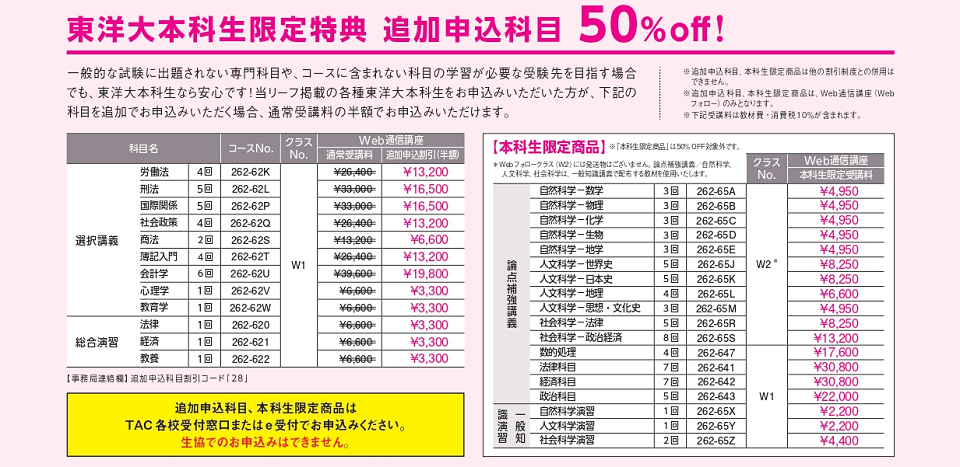 追加申込科目の割引は、東洋大学生協でのお申込みや他の割引制度との併用はできません。TAC各校受付窓口で直接お申込みください。