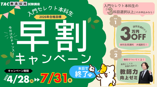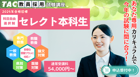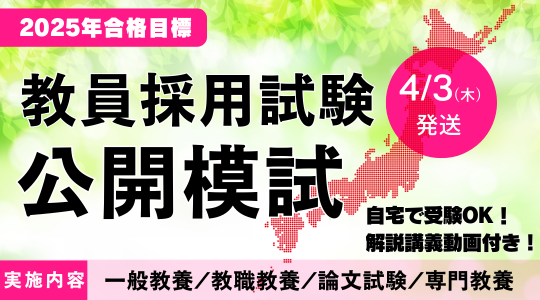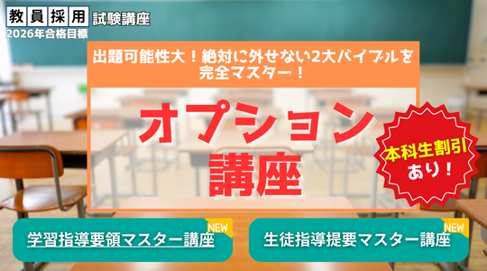 - 【期間限定特典つき】教員資格認定試験本科生お申込みで今なら「教職教養過去問100選」がついてくる(~26/1/31)