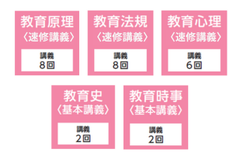 教育原理8回/教育史2回/教育法規8回/教育心理6回