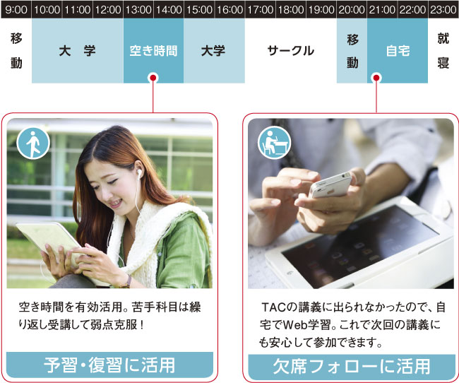 ①得意科目は大学の空き時間に倍速受講 ②苦手科目は繰り返し視聴して理解度UP ③休んでしまった教室講義を自宅で受講
