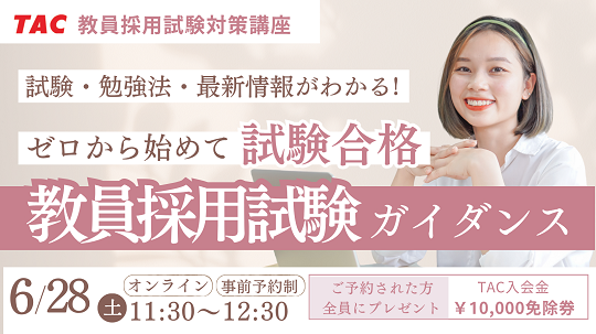 受験を決めた方も迷っている方も、まずはガイダンスにご参加ください。教員採用試験の試験制度、最新の試験動向、学習方法、TACのカリキュラムなど、受験や進路に役立つ情報を60分でご提供します。