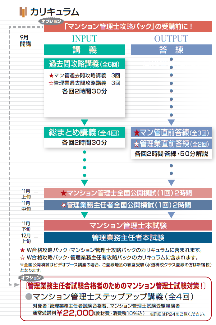 管理業務主任者試験を合格された後に、マンション管理士試験を挑戦される場合、改めて基本から学習するよりも、管理業務主任者試験に合格した知識を活かした学習を行う方がより効率的です。 5問免除対象科目の「適正化法」を省き、管理業務主任者試験との違いを把握し、マンション管理士試験特有の出題内容を重点的に押さえることのできる「マン管ステップアップ講義」と併せてのご受講をおススメします。