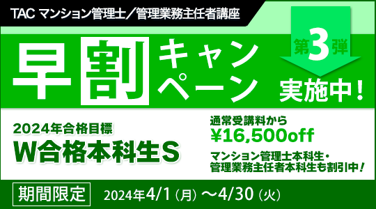 2024年合格目標「W合格本科生S」「マンション管理士本科生S」「管理業務主任者本科生S」をキャンペーン期間内にお申込みされた場合は、「通常受講料」から値引きいたします!