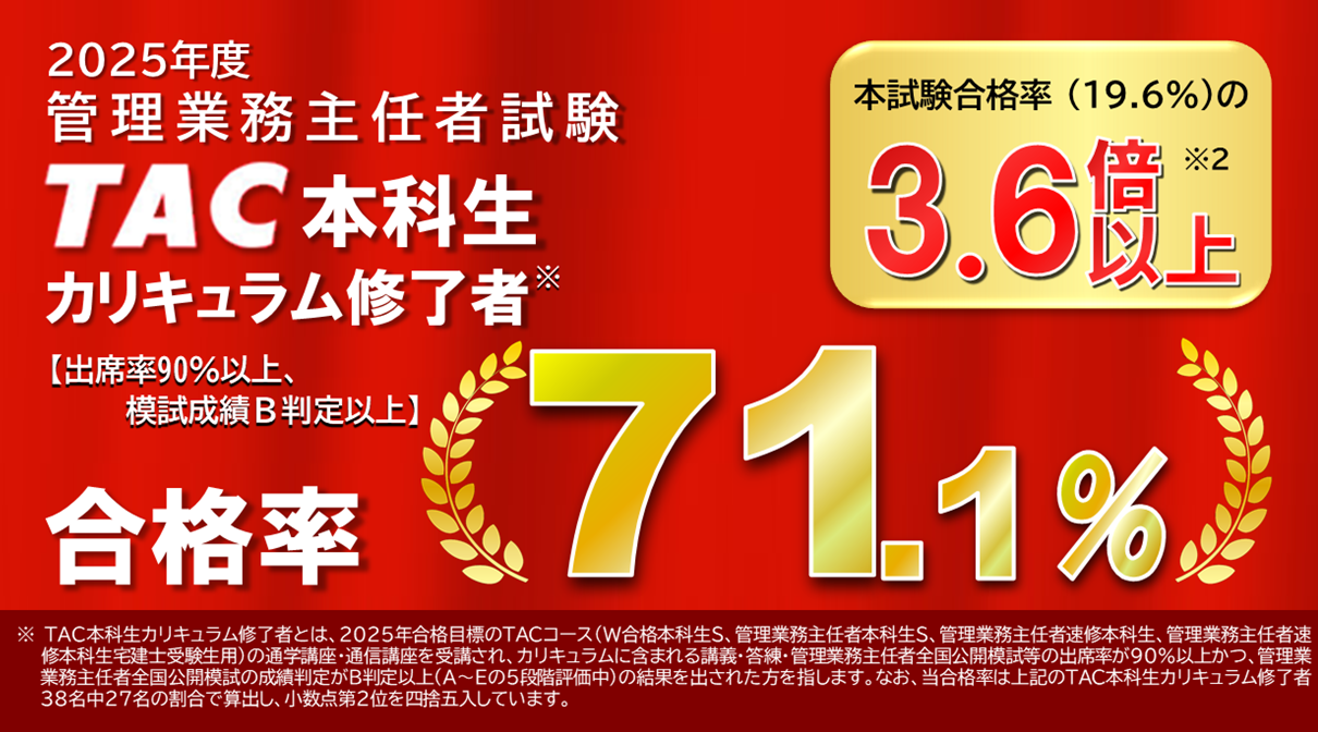TAC 本科生カリキュラム修了者とは、2025 年合格目標の TAC コース(W合格本科生S、管理業務主任者本科生S、管理業務主任者速修本科生、管理業務主任者速修本科生宅建士受験生用)の通学講座・通信講座を受講され、カリキュラムに含まれる講義・答練・管理業務主任者全国公開模試等の出席率が 90%以上かつ、管理業務主任者全国公開模試の成績判定がB判定以上(A~Eの5段階評価中)の結果を出された方を指します。なお、当合格率は上記の TAC 講座生カリキュラム修了者 38 名中 27 名の割合で算出し、小数点第 2 位を四捨五入しています。
