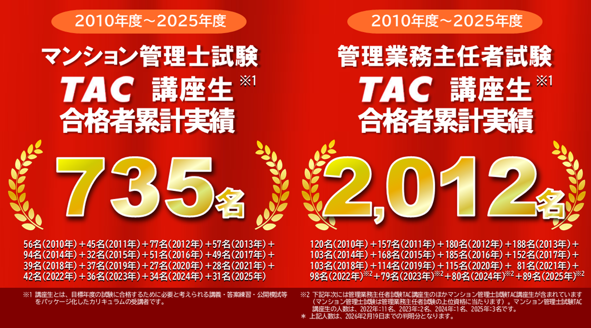 - 下記年次には管理業務主任者試験 TAC 講座生のほかマンション管理士試験 TAC 講座生が含まれています(マンション管理士試験は管理業務主任者試験の上位資格に当たります)。マンション管理 士試験 TAC 講座生の人数は、2022 年:11 名、2023 年:2 名、2024 年:1 名、2025 年:3 名です。