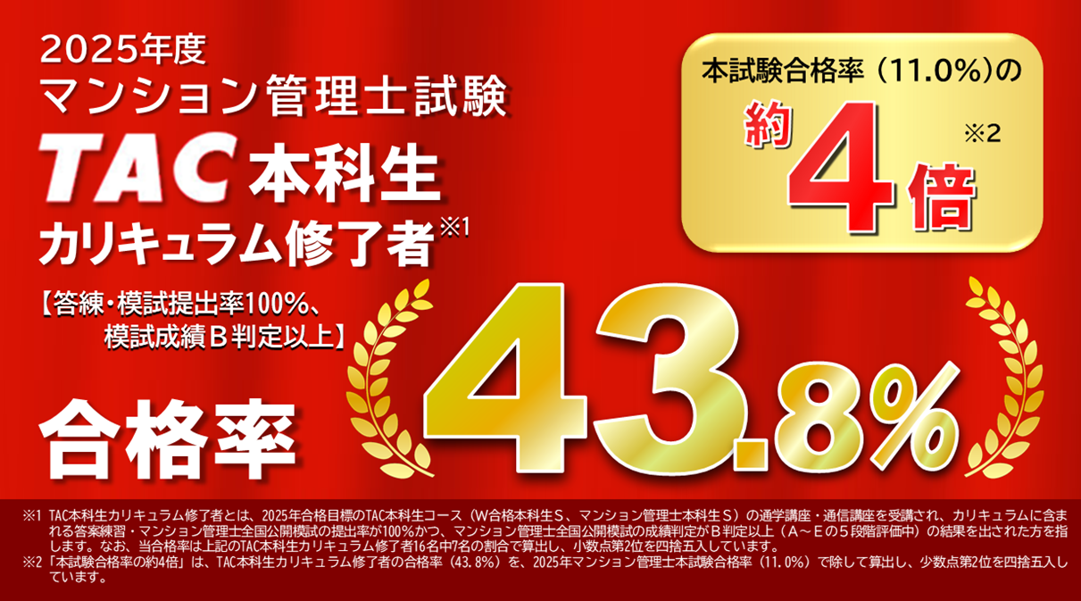- 「本試験合格率の約 4 倍」は、TAC 本科生カリキュラム修了者の合格率(43.8%)を、2025 年マンション管理士本試験合格率(11.0%)で除して算出し、少数点第 2 位を四捨五入しています。