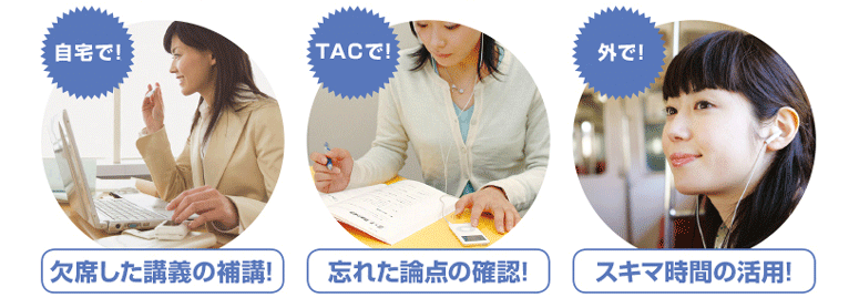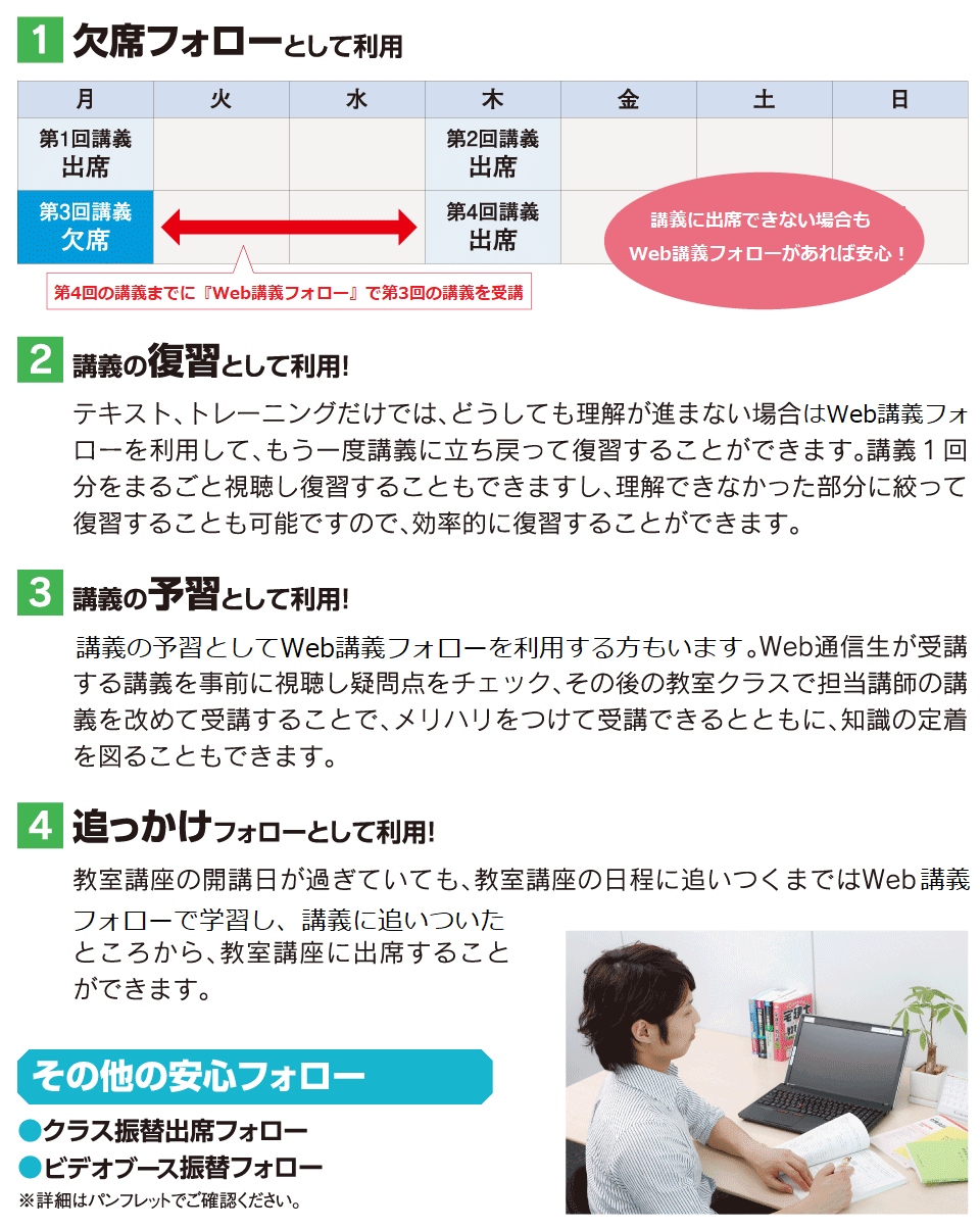 教室講義を収録したデジタル映像データをインターネットから視聴できます。もちろん、講義録(講義中の板書)もPDFデータでアップしていますので、板書をノートに写す手間も省くことができ、講義に集中できます。講義を休んだ場合のフォローや予習・復習にも使え、いつでも、どこでも効率よく学習することができます。通勤・通学時などのわずかな時間の学習用に大変便利です。