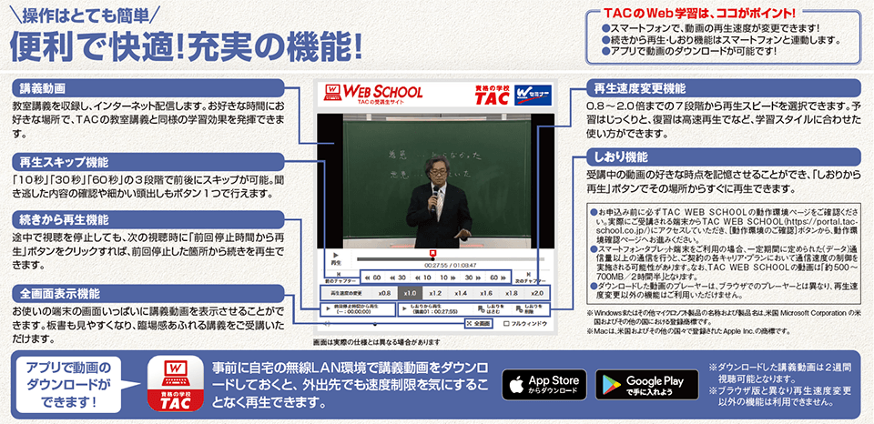 Web講義フォローは、一部の受講環境ではご利用いただけない場合がございます。お申込み前に必ずTAC WEB SCHOOLの動作環境ページをご確認ください。実際にご受講される端末からTAC WEB SCHOOLにアクセスしていただき、[TAC WEB SCHOOL動作環境のご案内]ボタンから、動作環境チェッカーページへお進みください。