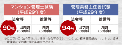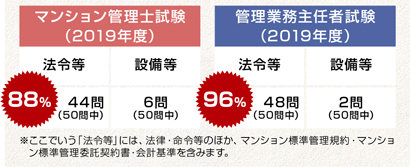 両試験の出題範囲を分類すると「法令等の知識を問う問題」と「設備等の実務的知識を問う問題」に分けることができます。両試験の出題範囲の約9割が「法令等」からの出題で、学習時間の大半はここに充てなくてはなりません。もちろん、「設備等」の出題も無視はできませんが、大きなウエイトを占めている「法令等」を得意分野とし、しっかりと対策を立てることが合格への近道となり、短期合格につながります。