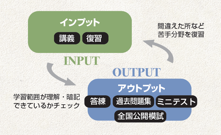受験勉強では、インプットとアウトプットを組み合わせての学習が効果的です。講義でインプットした内容は、ミニテスト、過去問題集、答練を繰り返し解くことにより確実に身に着けることが出来ます。