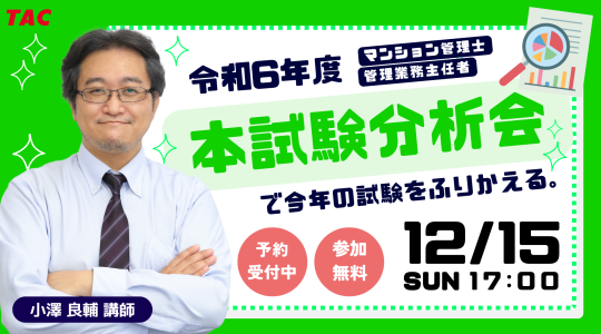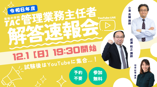 本試験当日にTAC管理業務主任者講座講師陣が本試験問題を検討し、予想正答番号と講評をLIVE配信でお伝えいたします!是非ご視聴ください!