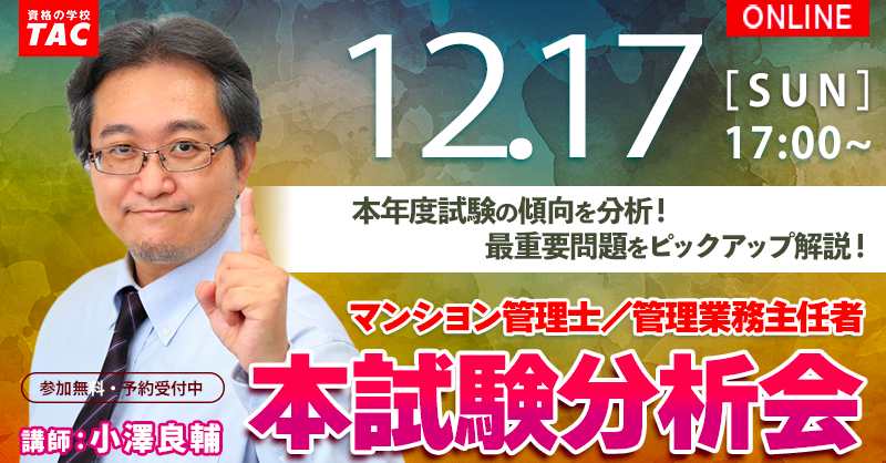 本年度のマンション管理士試験、管理業務主任者試験を分析!近年の試験傾向も含めてお話しします。さらに、今年度解けるべきだった・解けなければならなかった最重要の問題をピックアップして解説します。カメラ不要・マイク不要ですので、ぜひご参加ください!