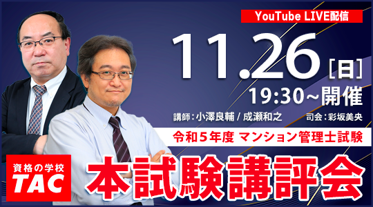 本試験当日にTACマンション管理士講座講師陣が本試験問題を検討し、予想正答番号と講評をお伝えいたします!是非ご視聴ください!