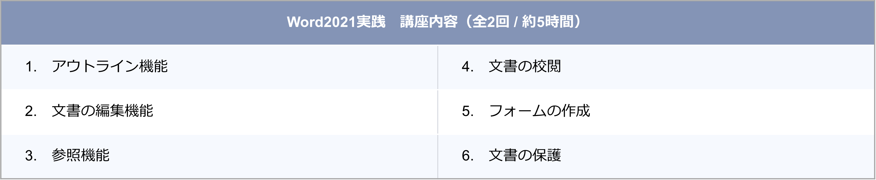 「Word2021実践」では、Wordでフォームの作成や文書の保護、校閲や参照機能など目的や状況に応じた様々な機能を習得できます。