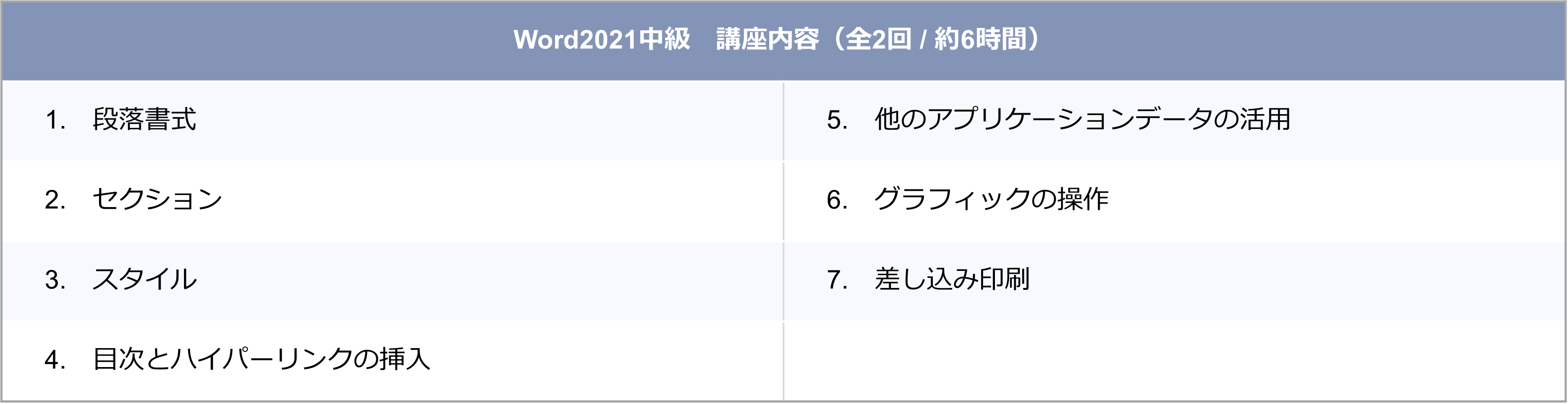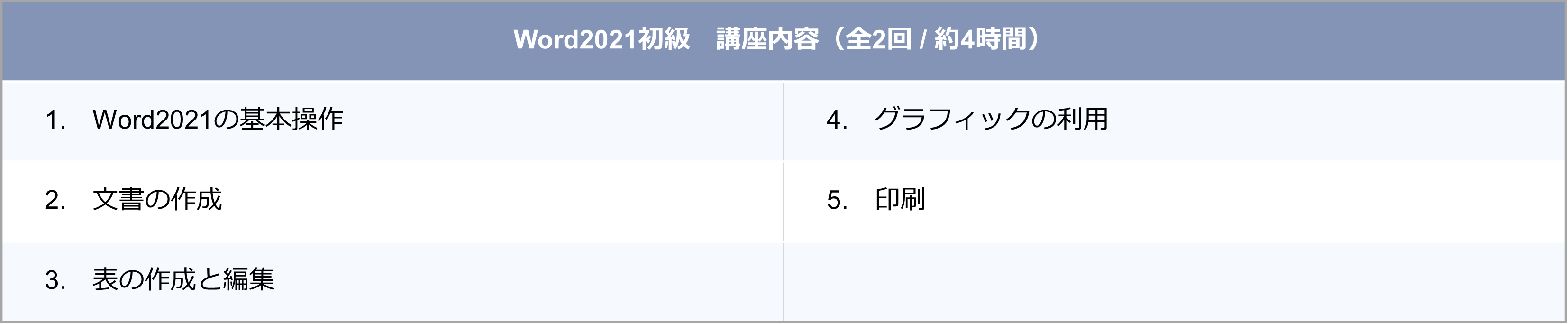 Word初級 全2回(約4時間)、Word中級 全2回(約6時間)、Word実践 全2回(約5時間)