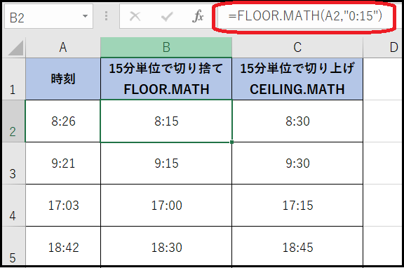 - 『 =FLOOR.MATH( A2, “0:15” )』と入力します。