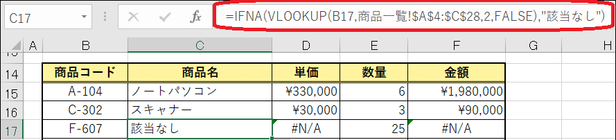 - 『 =IFNA(VLOOKUP(B17,商品一覧!$A$4:$C$28,2,FALSE),"該当なし") 』と入力します。入力した商品コードが一覧表に登録されていない場合は、『該当なし』と表示されるようにIFNA関数を追加します。