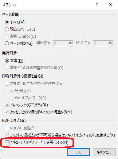 - [オプション]ダイアログボックスの「PDFのオプション」にある「ドキュメントをパスワードで暗号化する」のチェックをオンにします。