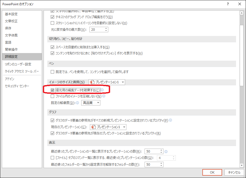 - 「イメージのサイズと画質」の「復元用の編集データを破棄する」のチェックをオンにします。