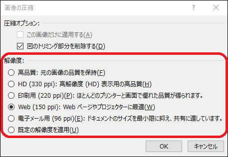 - [画像の圧縮]ダイアログボックスの「解像度」から適切な解像度を選択します。サイズを極力小さくしたい場合は、解像度は、電子メール用などを選ぶといいでしょう。