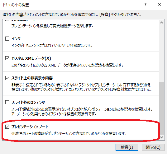 - [ドキュメント検査]ダイアログボックスが表示されます。「プレゼンテーションノート」のチェックをオンにして、[検査]ボタンをクリックします。