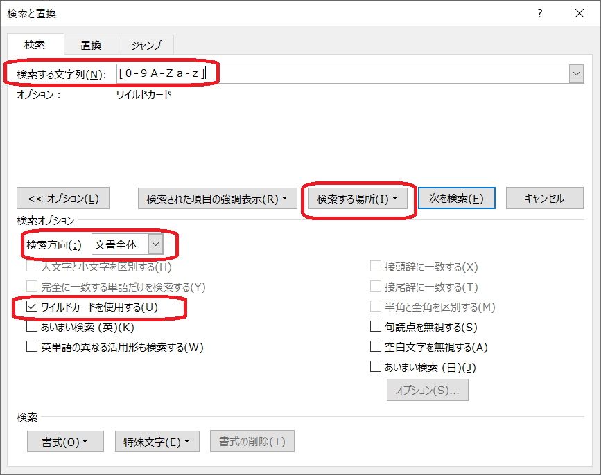 - 「検索する文字列」に『[0-9A-Za-z] 』と入力します。このとき、[ ]の大括弧と-のハイフンは半角、英数字は全角で入力してください。