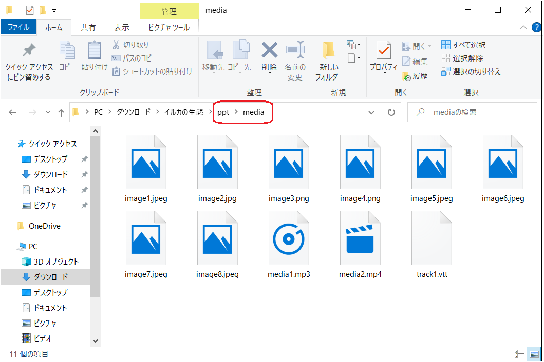 - 解凍後に作成された「ppt」フォルダー内の「media」フォルダーを開きます。ファイル内に挿入されている画像ファイルがまとめて格納されています。