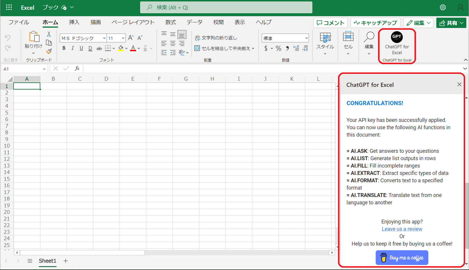 - 「CONGRATULATIONS!」と表示されたら、「Chat GPT for Excel」アドインが利用できるようになります。