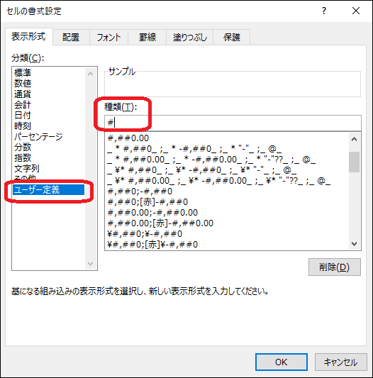 - [ セルの書式設定 ]ダイアログボックスが表示されます。[ 表示形式 ]タブで「分類」は「ユーザー定義」を選択します。