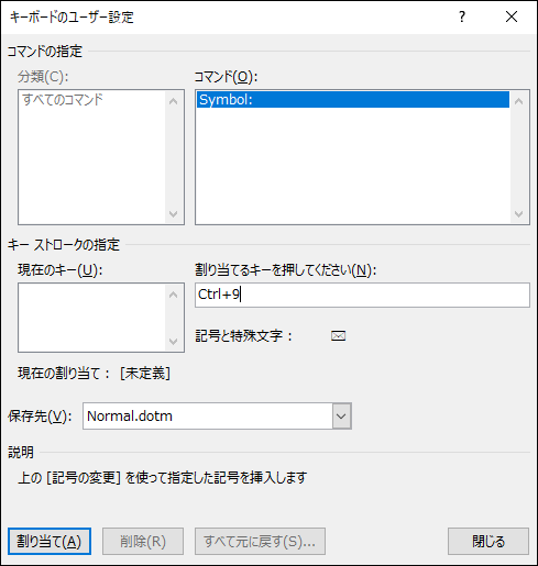 この時、「 現在の割り当て 」が未定義(ほかの記号に割り当てられていない)であることを確認します。 - [ 割り当て ]ボタンをクリックします。