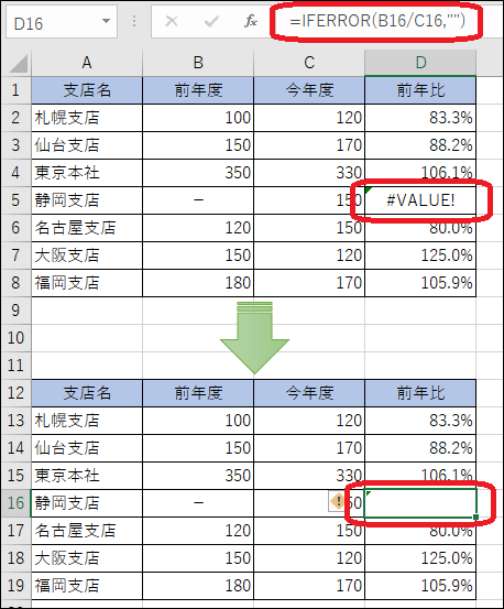 なお、IFNA関数で対応できるのは「#N/A」エラーのみで、「#N/A」以外のエラーはそのまま表示されます。「#N/A」以外のエラーも一律に対応したい場合は、IFERROR関数を使用します。