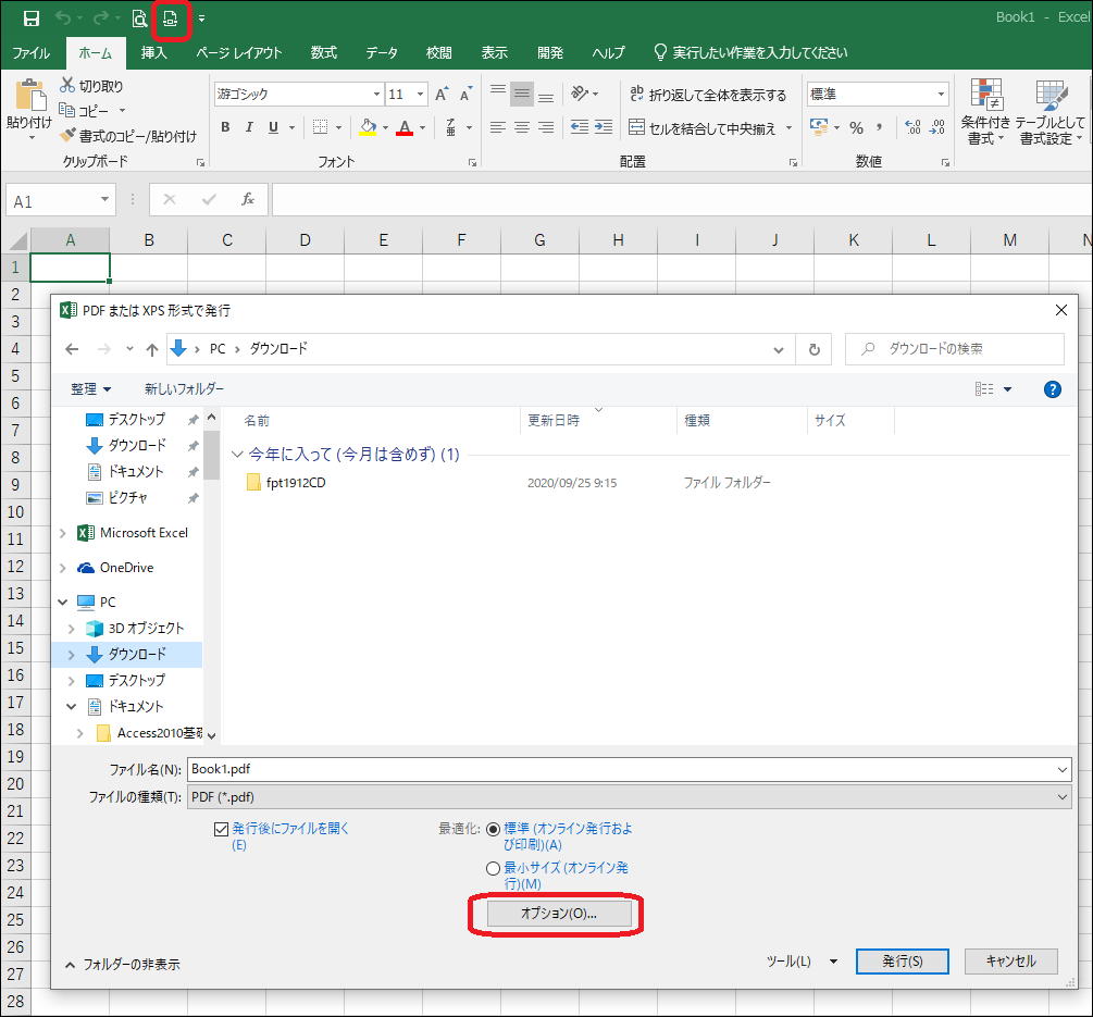 - [PDFまたはXPS形式で発行]ダイアログボックスの[オプション]ボタンをクリックします。