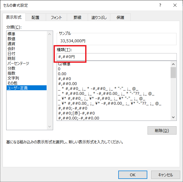 - 「種類」に『 #,##0, 』と入力します。最後のカンマを忘れずに入力します。