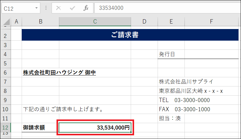選択していたセルの数値の単位が千円となり、単位も含めてセルに表示することができます。