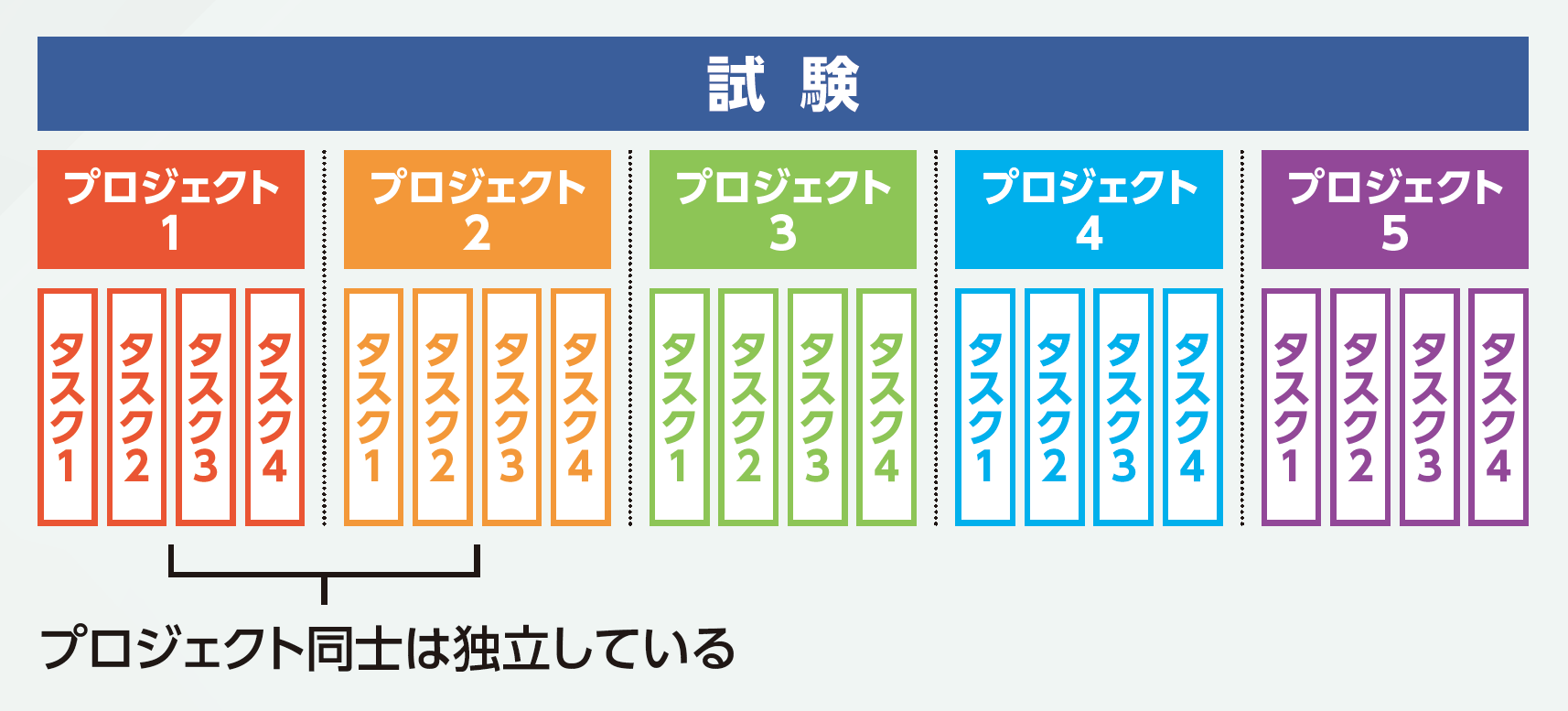 MOSは「マルチプロジェクト」という出題形式で実施されます。試験は5個~7個の「小さなプロジェクト」で構成されます。ひとつのプロジェクトには4個~7個の「タスク」と呼ばれる問題が含まれており、プロジェクトごとに一つのファイルが開き、そのファイルに対して指示された操作を行います。
