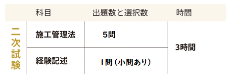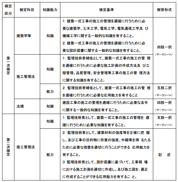 | 能力 | 2.監理技術者補佐として、建築一式工事の施工の管理を適確に行うために必要な応用能力を有すること。 | 五肢択一 (マークシート) |