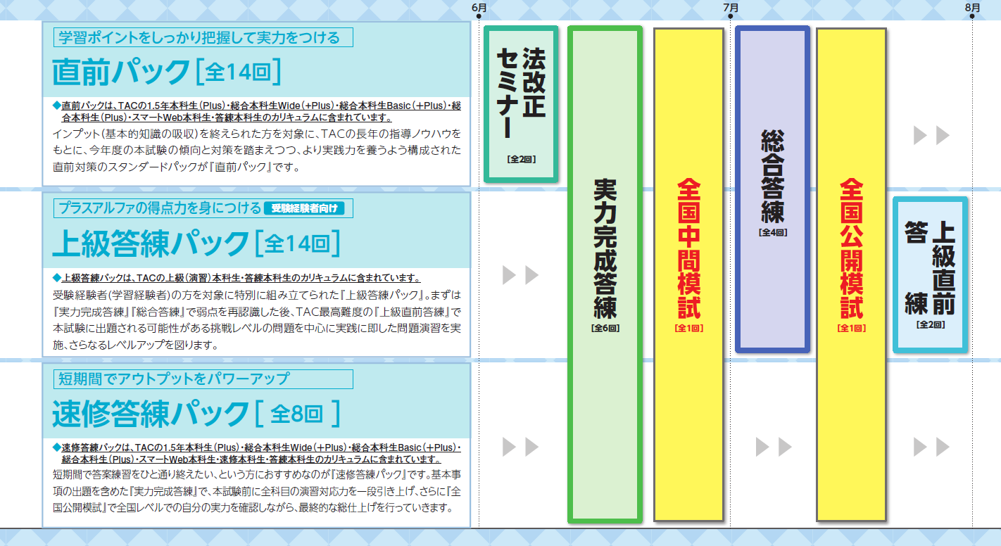 実力完成講座は、TACの各本科生に直前期から合流するコース。本試験レベルの答練を中心に、TAC本科生と競い合うことでこれまで身につけた知識を一気に本試験合格レベルへと引き上げます。